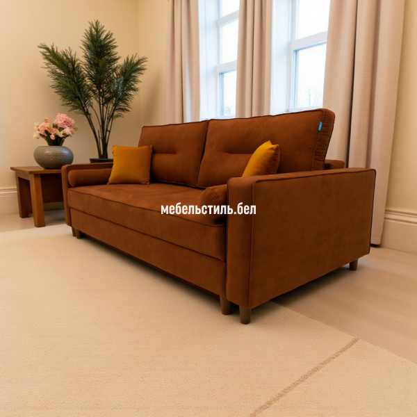 Диван-кровать Галина-1 современная, удобная, простая модель в скандинавском стиле. Широкое спальное место. Сидение и спинка на основе независимого пружинного блока. Имеется емкость для постельных принадлежностей. Боковины съемные, ножки — натуральное дерево. В комплект входят 2 подушки спинки, 2 валика и 2 декоративные подушки. Может изготавливаться в разных цветовых решениях. Механизм трансформации – «еврокнига».