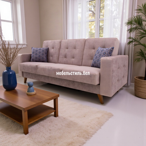 Диван-кровать Доменика — современная, практичная модель предназначенная для ежедневного отдыха. Идеальное решение для небольшой гостиной городской квартиры. Диван на опорах из натурального массива, он будет удачно гармонировать с изделиями из натуральных пород дерева. В комплект входят две декоративные подушки. Имеется ящик для хранения. Механизм трансформации «книга» обеспечивает надёжность эксплуатации дивана.