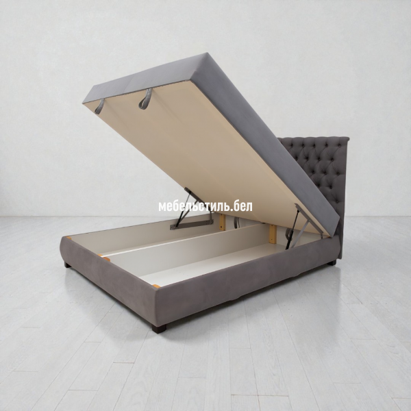 Кровать оснащена подъемным механизмом, в ней предусмотрен крупный ящик для хранения белья и постельных принадлежностей. В комплект входят 2 декоративные подушки.