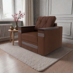 Для наполнения сиденья и спинки использован плотный пенополиуретан. Это износостойкий материал, который хорошо держит форму и не собирается в комья. Основой конструкции спинки и сиденья служит независимый пружинный блок. Он выдерживает высокие нагрузки, не позволяет сиденью провисать. Подлокотники оснащены накладками, что позволяет использовать их как столик.