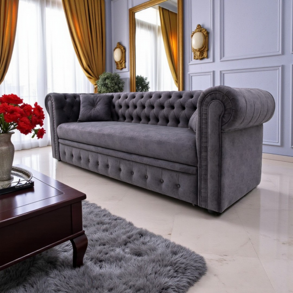 Диван Эстер является воплощением надежности, долговечности и презентабельности. Украшением данного дивана является изогнутый подлокотник и многорядная каретная стяжка спинки. Изящество, строгость и безупречность линий дивана Эстер подчеркнут интерьер вашего кабинета или гостиной в классическом стиле. Верхнее и выдвижное сидение на основе пружинного блока. Спинка на основе пенополиуретана. В разложенном виде представляет 2-х спальную кровать. Так как выдвижная часть дивана находится под основным сидением, отсутствует короб для хранения. Основание сидения – пиломатериалы хвойных пород. В комплект входят 2 декоративные подушки. Может изготавливаться в разных цветовых решениях. Модель оснащена механизмом раскладки «дельфин».